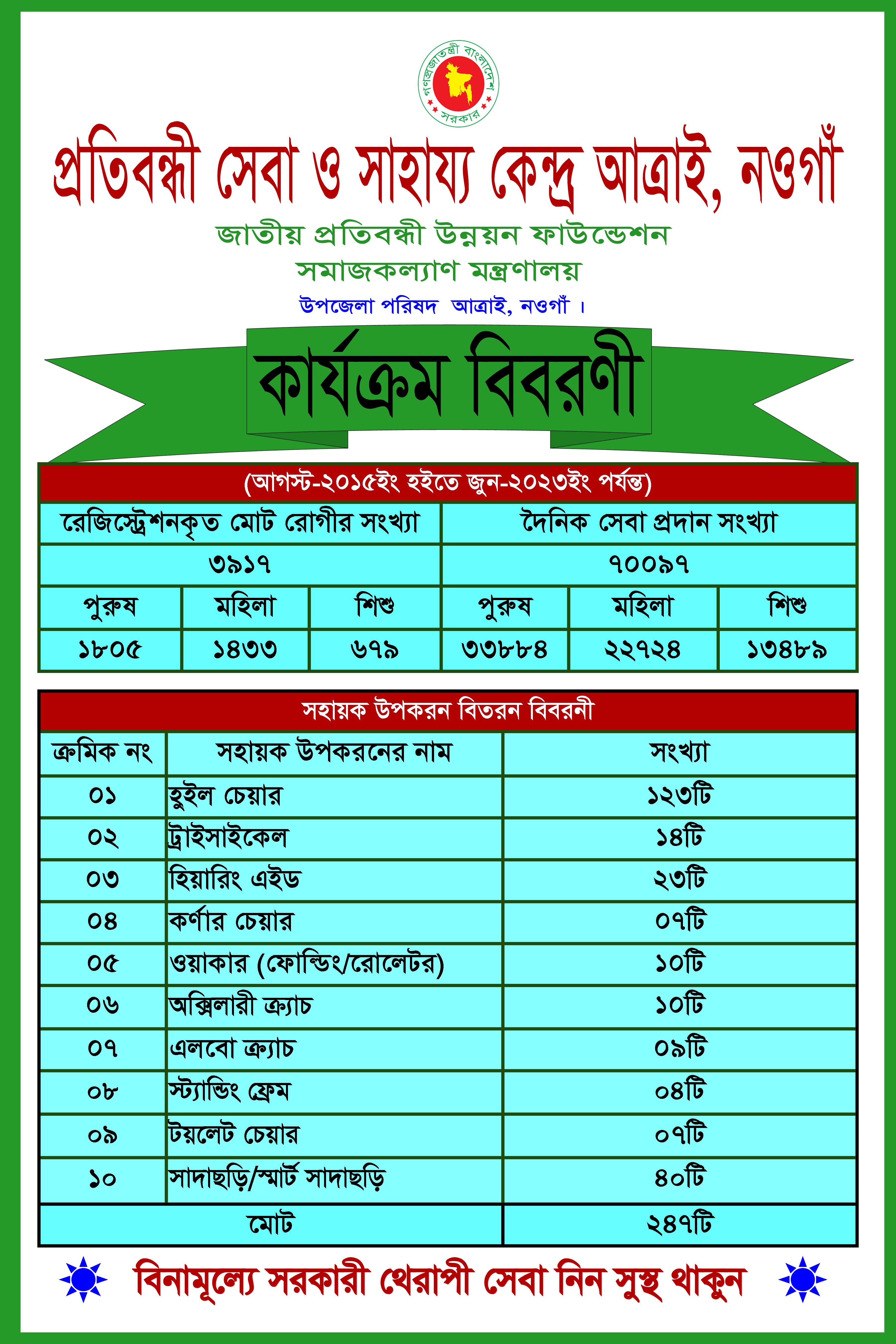 প্রতিবন্ধী সেবা ও সাহায্য কেন্দ্র্র আত্রাই, নওগাঁ এর সেবা কার্যক্রম ও সহায়ক উপকরনের বিবরন সমূহ । আগস্ট ২০১৫ইং হতে জুন-২০২৩ ইং পর্যন্ত।